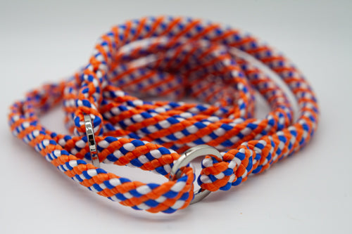Wilhelmina ingår i vår serie koppel som tillverkas av ett ihåligt polypropylenrep som på samma gång är både lätt och slitstarkt. Repet är flätat utan kärna – vilket gör det platt – och är ca 12 mm brett och 3 mm tjockt. Kopplets ändar/fästpunkter är alla splitsade vilket gör att det varken har sömmar, klämmor eller andra material än bara just själva repet och de två guldfärgade ringarna.